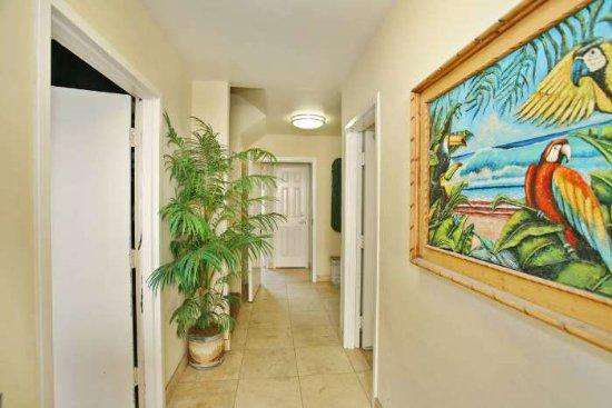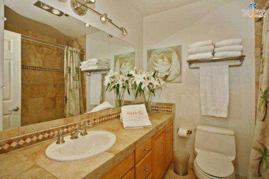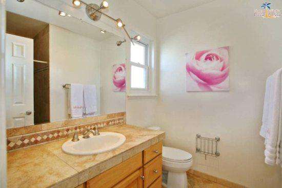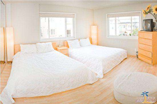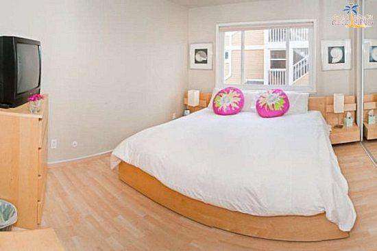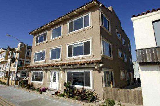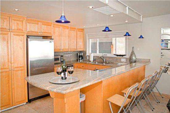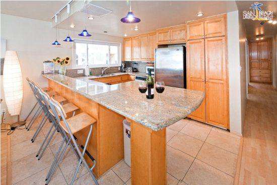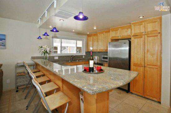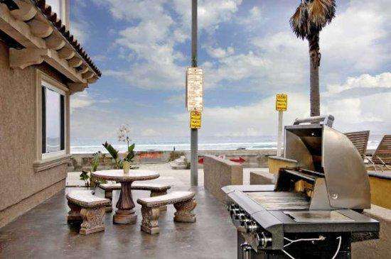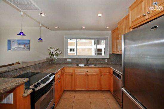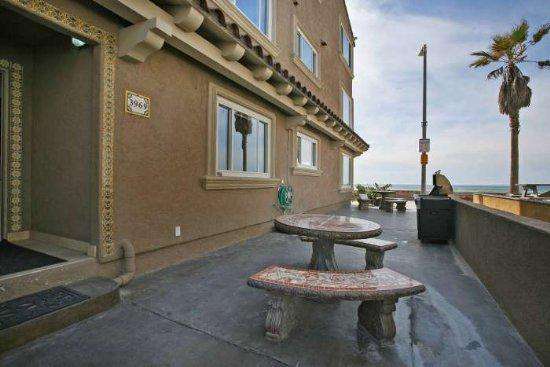 There are many high end treatments making this vacation rental comfortable and accommodating including travertine throughout, granite countertops, stainless steel appliances, washer/dryer in the unit, dishwasher, wireless internet and parking. There is a community patio with a large stainless steel barbecue and picnic tables. The patio has a view of the ocean!